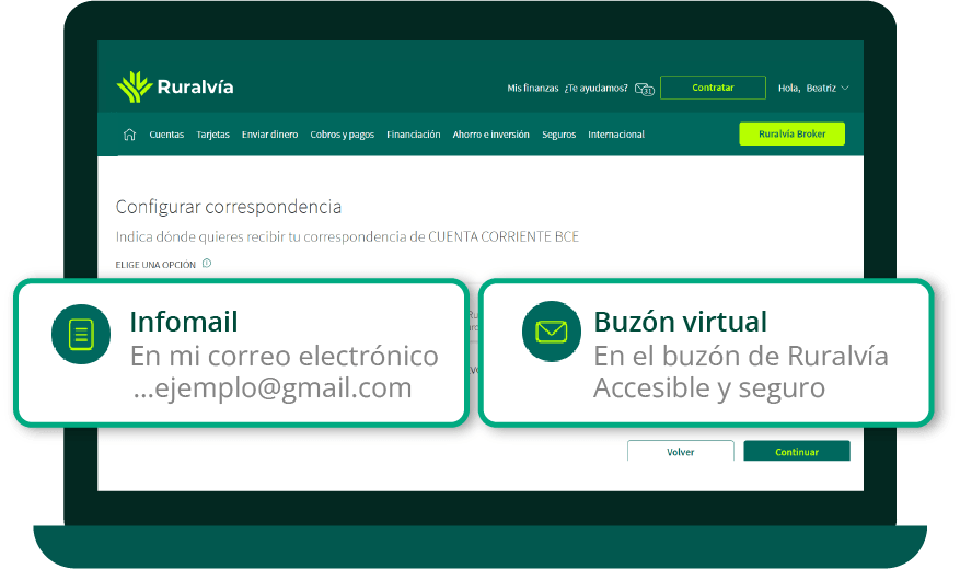 Elige dónde quieres recibir tu correspondencia online: en tu buzón virtual de Ruralvía o en tu correo personal.